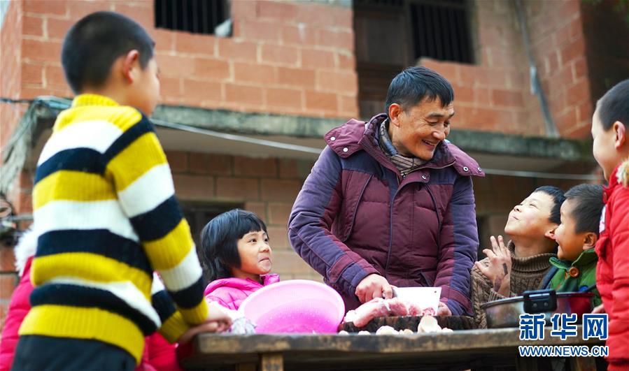 1月3日,章站亮(左三)在學(xué)校的操場上切肉。由于學(xué)校沒有室內(nèi)的廚房和食堂,章站亮只能在露天的環(huán)境下為學(xué)生們準備餐點。 新華社記者 胡晨歡 攝