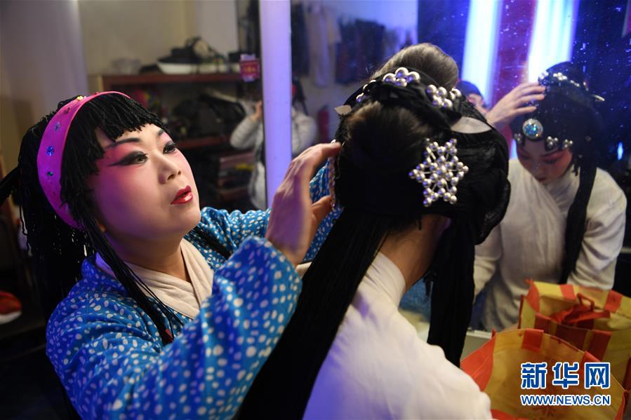1月14日,在頤融堂戲曲體驗(yàn)館里,演員在登臺前整理發(fā)飾。新華社記者 范培珅 攝