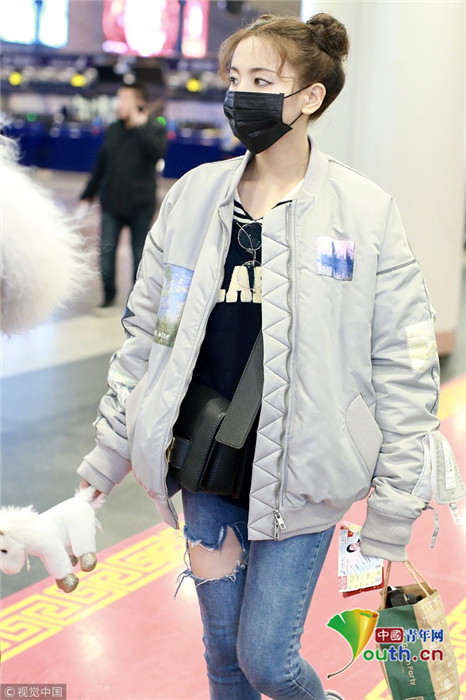 2019年1月14日,北京,楊超越現(xiàn)身機(jī)場(chǎng)。她扎哪吒頭活力十足,甩玩偶淘氣回眸,穿破洞褲露美腿,披面包服似自帶鼓風(fēng)機(jī)。