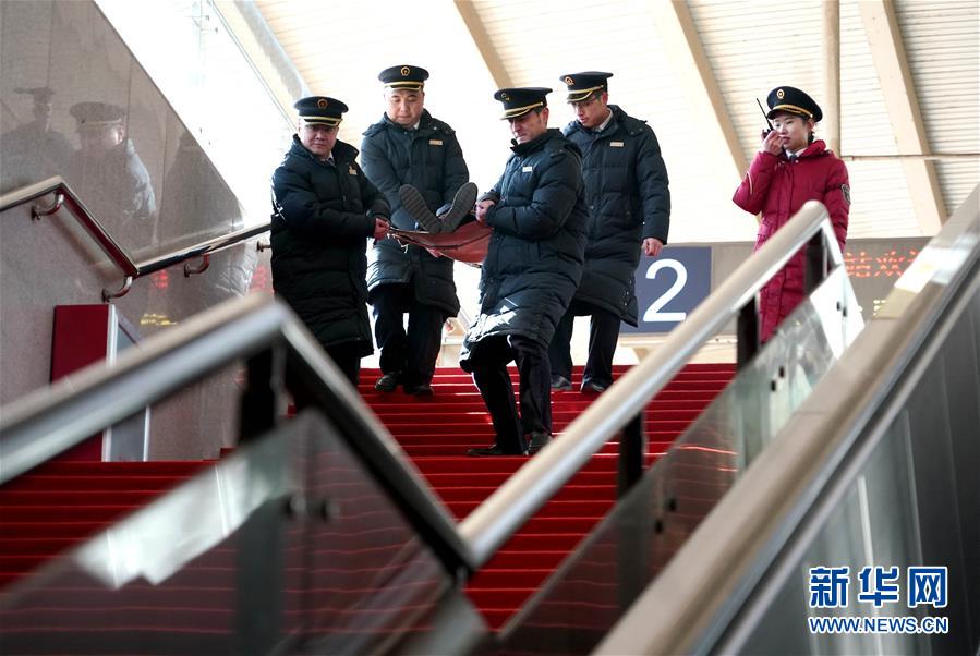 1月16日,鶴壁東站的職工在進(jìn)行列車下交重傷病旅客應(yīng)急演練。 當(dāng)日,中國鐵路鄭州局集團(tuán)有限公司新鄉(xiāng)車務(wù)段鶴壁東站組織職工開展服務(wù)禮儀、手語等業(yè)務(wù)培訓(xùn),并進(jìn)行非正常情況應(yīng)急演練,為2019年春運做準(zhǔn)備。 新華社記者李安攝