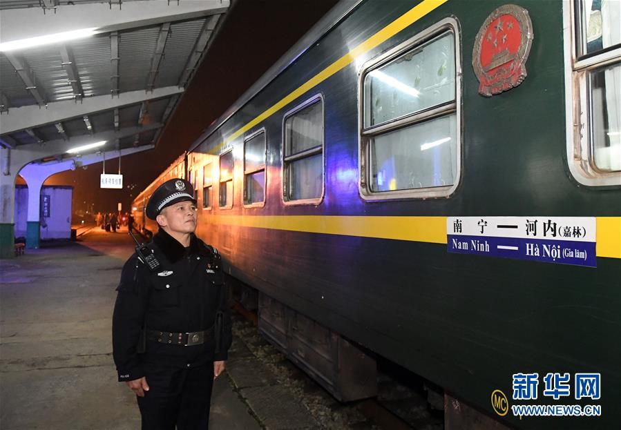在廣西憑祥火車站,鐵路公安民警陸日峰在一列準備開往越南的火車旁值勤(2018年12月31日攝)。 新華社記者陸波岸攝