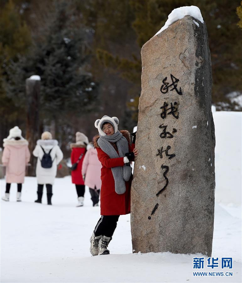 1月24日,在黑龍江省漠河市北極村,游客在“我找到北了”石碑旁留影。新華社記者王毓國(guó)攝