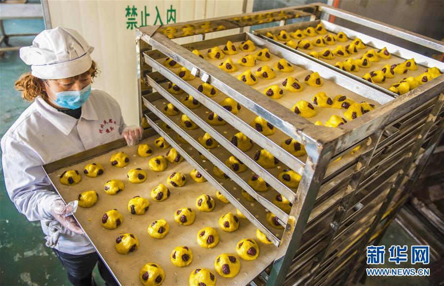 1月25日,在河北棗強一家食品公司,工人將新鮮花糕出爐。 春節(jié)臨近,河北省棗強縣面食加工廠的面點師傅們忙著趕制花糕、花饃等傳統(tǒng)面食,以供應節(jié)日市場。當?shù)赜羞^年蒸花糕、做花饃的習俗,寓意步步登高,生活一年比一年好。 新華社記者 李曉果攝