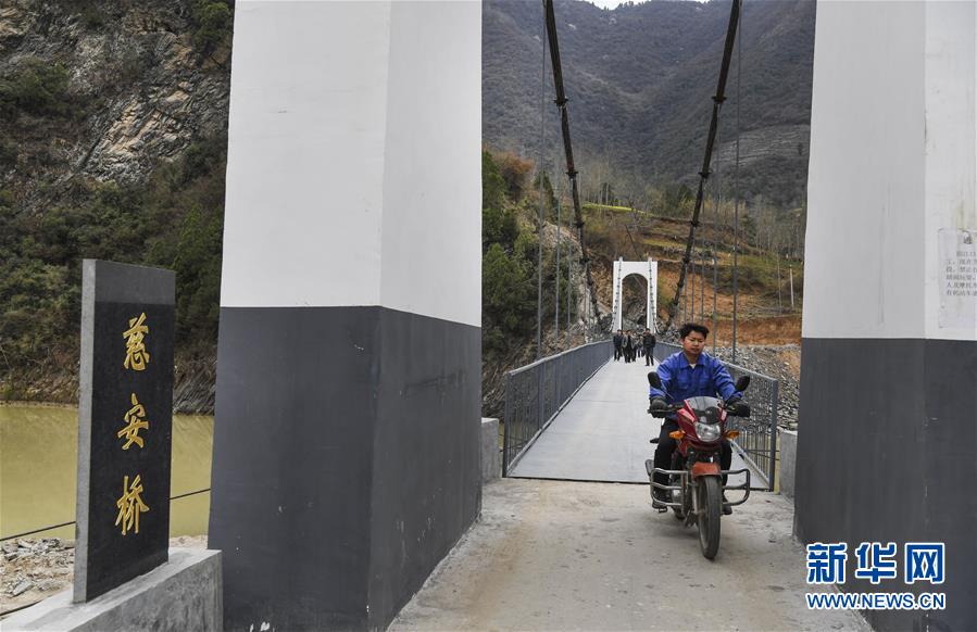 3月25日,略陽縣徐家坪鎮(zhèn)藥木院村村民騎著摩托車行駛在新修的鋼結構吊橋上。 新華社記者陶明攝