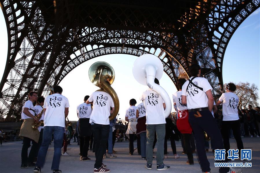 3月30日,在法國巴黎,樂隊在埃菲爾鐵塔下表演。于1889年3月31日正式落成的法國巴黎埃菲爾鐵塔迎來130歲生日。從30日起,包括演出、冒險游戲、圖片展在內的多項活動在埃菲爾鐵塔舉行,為這座宏偉建筑慶生。新華社記者 高靜 攝