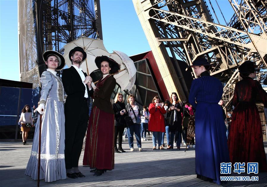 3月30日,在法國巴黎,音樂劇《300米高塔》的演員身著19世紀服裝在埃菲爾鐵塔一層平臺與游客合影。于1889年3月31日正式落成的法國巴黎埃菲爾鐵塔迎來130歲生日。從30日起,包括演出、冒險游戲、圖片展在內的多項活動在埃菲爾鐵塔舉行,為這座宏偉建筑慶生。新華社記者 高靜 攝
