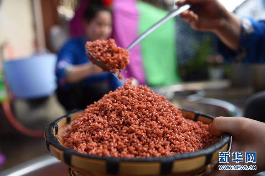 4月16日,在貴州省臺(tái)江縣姊妹街哆蝶五彩姊妹飯?bào)w驗(yàn)店,苗家婦女在制作五彩“姊妹飯”。新華社發(fā)(劉開福 攝)