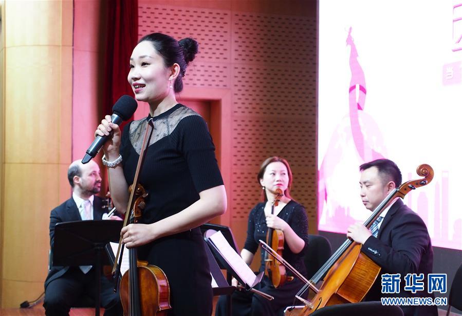 4月25日,上海交響樂團的中提琴手巴桐在演奏前介紹曲目。 當日,第一場“全城交響·上交為你而來”音樂會在復旦大學附屬腫瘤醫(yī)院報告廳奏響,為患者及醫(yī)護人員獻上一場專屬音樂會?!叭墙豁憽ど辖粸槟愣鴣怼笔巧虾=豁憳穲F2019年向全上海的機構及個人開放的公益演出項目。 新華社記者 任瓏 攝