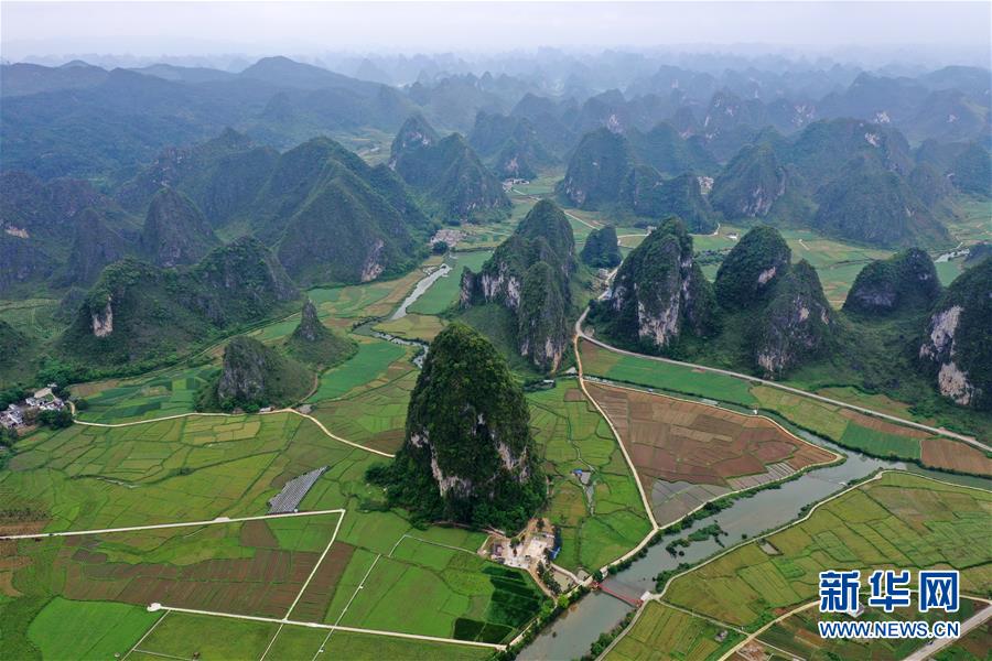 這是廣西靖西市新靖鎮(zhèn)境內(nèi)的田園風(fēng)光(4月16日無人機拍攝)。 新華社記者 陸波岸 攝
