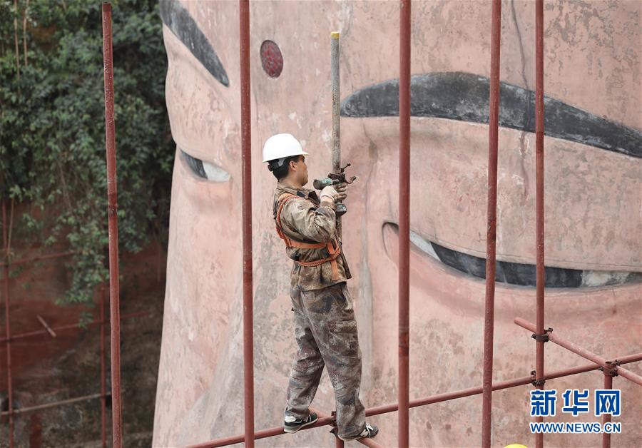 12月10日前后已逐步遮蔽大佛頭部,對(duì)頭面部進(jìn)行勘測(cè);12月底將開(kāi)始拆除頭部腳手架,保證2019年元旦節(jié)之前,先露出佛頭,供游客觀賞。