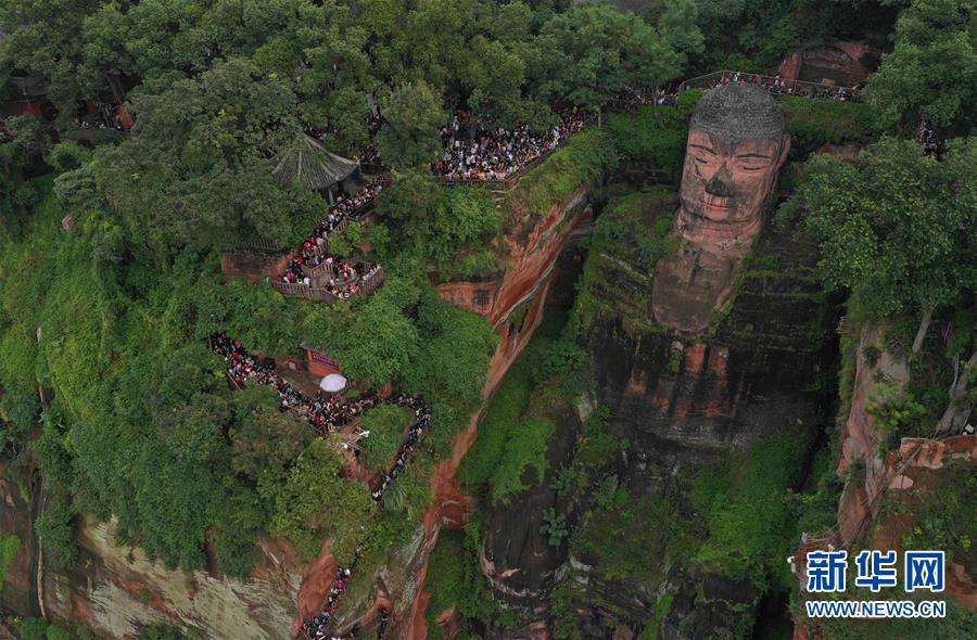 10月4日,游客在樂(lè)山大佛前排隊(duì)一睹大佛真容(無(wú)人機(jī)拍攝)?!⌒氯A社記者 江宏景 攝