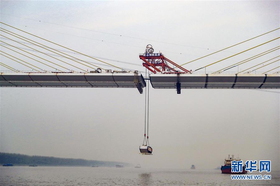 工人在池州長(zhǎng)江公路大橋施工現(xiàn)場(chǎng)吊裝最后一塊鋼箱梁(3月29日攝)。 新華社記者曹力攝