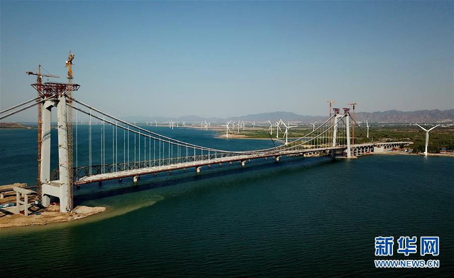 建設(shè)中的官?gòu)d水庫(kù)公路大橋(5月6日無人機(jī)拍攝)。 河北省懷來縣官?gòu)d水庫(kù)公路大橋是懷來沙城至東花園公路的節(jié)點(diǎn)工程,預(yù)計(jì)該橋?qū)⒂?019年6月竣工。 新華社記者 楊世堯 攝