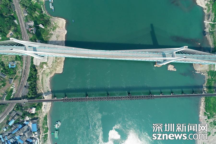 新白沙沱長(zhǎng)江特大橋在老橋下游100米左右位置跨越長(zhǎng)江,全長(zhǎng)約5.3公里,為上下兩層六線鐵路橋,上層為四線鐵路客運(yùn)專線,2018年1月25日隨著渝貴鐵路通車正式投入運(yùn)營(yíng)。該橋是渝貴鐵路全線規(guī)模最大、技術(shù)最為復(fù)雜的控制性工程,是世界上首座六線鐵路鋼桁梁斜拉橋,也是世界上每延米載荷量最大的橋梁,同時(shí)也是世界上首座雙層鐵路鋼桁梁斜拉橋。