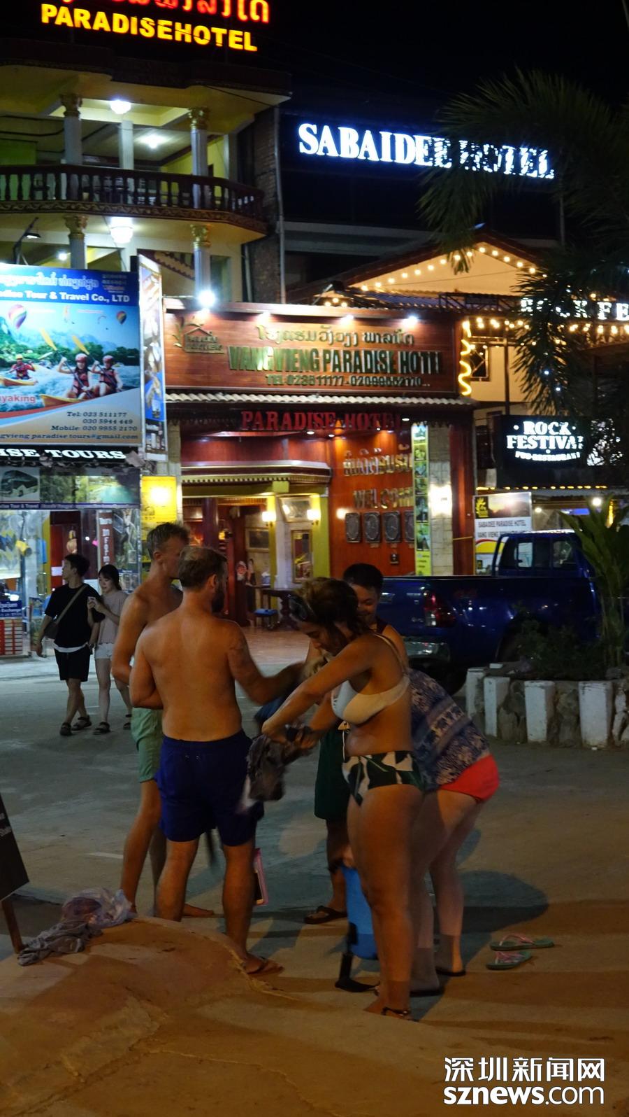 萬榮的開放程度很高。夜晚,南松河畔、街道兩旁都是酒吧,常??梢钥吹狡骰貋砩碇狙b的“老外”當(dāng)街站立。李仁奇 攝