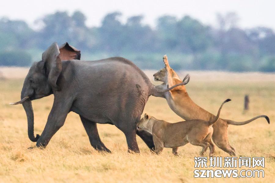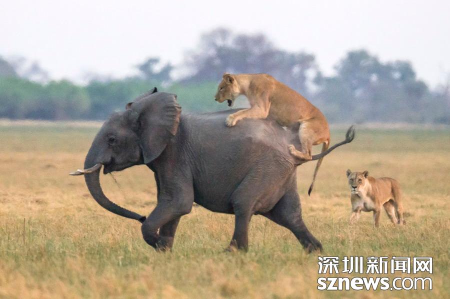 英國攝影師詹姆斯(James Gifford)在博茨瓦納喬貝國家公園拍到一群獅子獵食大象的精彩畫面。在詹姆斯的鏡頭下,一頭母獅跳到了一頭小象的背上想要將其拿下,但僅憑一己之力又不能做到。但當母獅的后援抵達時,象群也趕到了現場。最終,小象回到了象群中獲得庇護,而獅群也不得不悻悻離去。