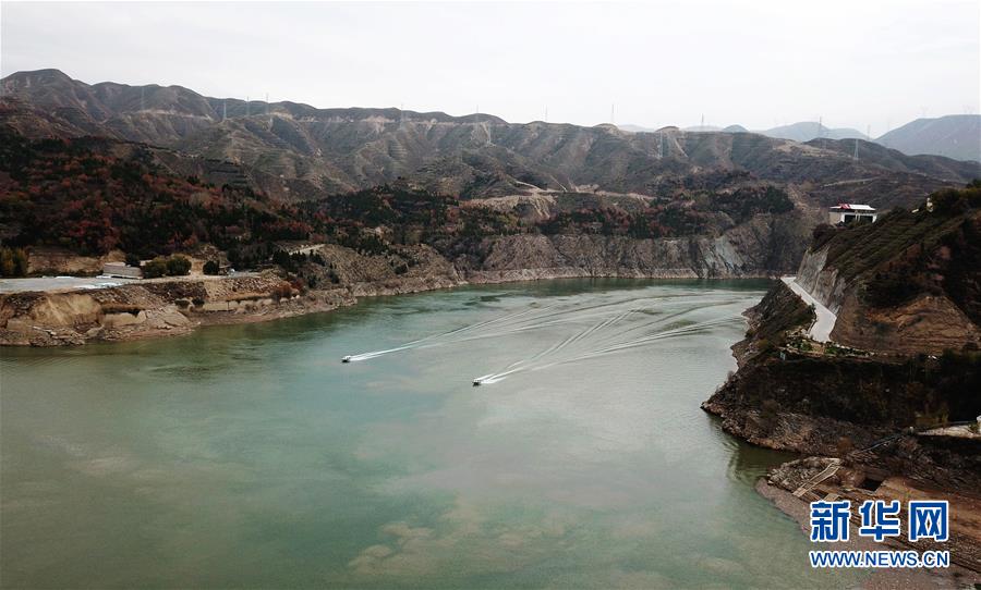 10月24日,兩艘快艇從劉家峽水庫庫區(qū)駛過(無人機拍攝)。 新華社記者 陳斌 攝