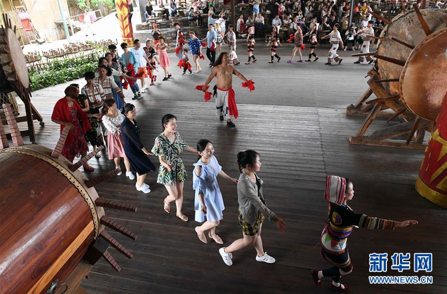 游客與基諾族大鼓舞演員一起跳舞(6月1日攝)。 在云南省西雙版納傣族自治州景洪市基諾山基諾族鄉(xiāng)的基諾族村寨,每天的基諾大鼓舞表演吸引了眾多游客前來觀賞體驗,帶動了基諾族群眾就業(yè)和增收?;Z族大鼓舞蘊涵豐富的歷史文化內(nèi)涵,已被列入國家級非物質(zhì)文化遺產(chǎn)保護(hù)名錄。 新華社記者 楊宗友 攝