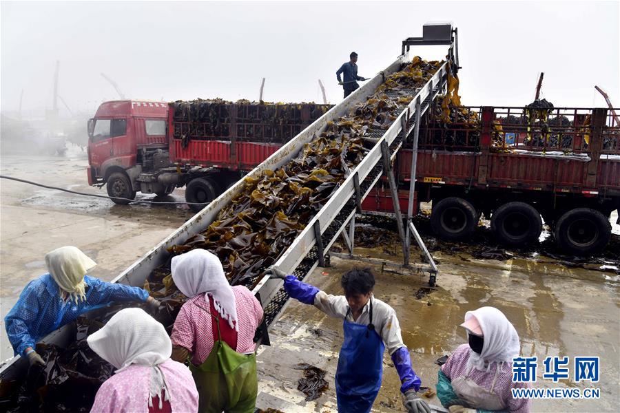 6月5日,在榮成市尋山街道青魚(yú)灘村,漁民在加工剛收獲的海帶。 近日,山東省榮成市迎來(lái)海帶收獲季。據(jù)悉,榮成市海帶養(yǎng)殖面積14.5萬(wàn)畝,年產(chǎn)海帶43.3萬(wàn)噸以上。 新華社記者郭緒雷攝