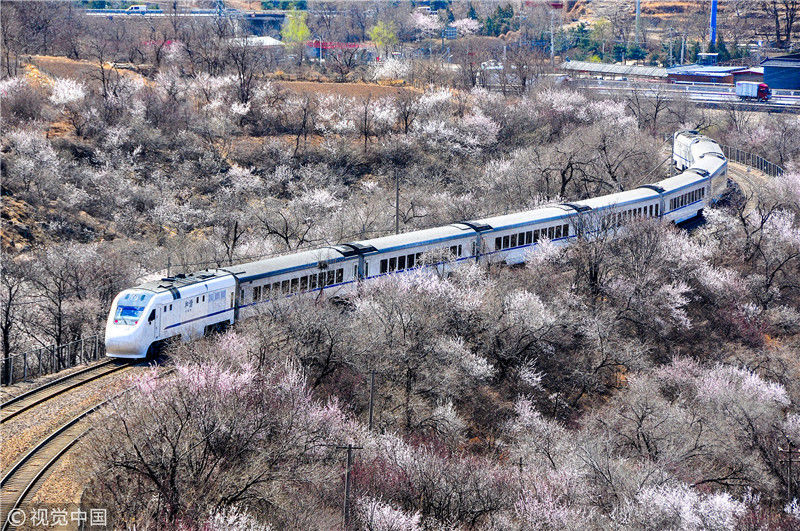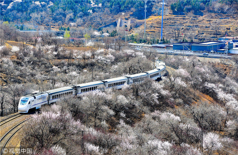 2019年3月22日,北京居庸關(guān)附近的山花盛開(kāi),S2線列車穿行在花海之中,構(gòu)成一幅美麗的畫面。時(shí)永平/千龍圖像/視覺(jué)中國(guó) 編輯/陳進(jìn)