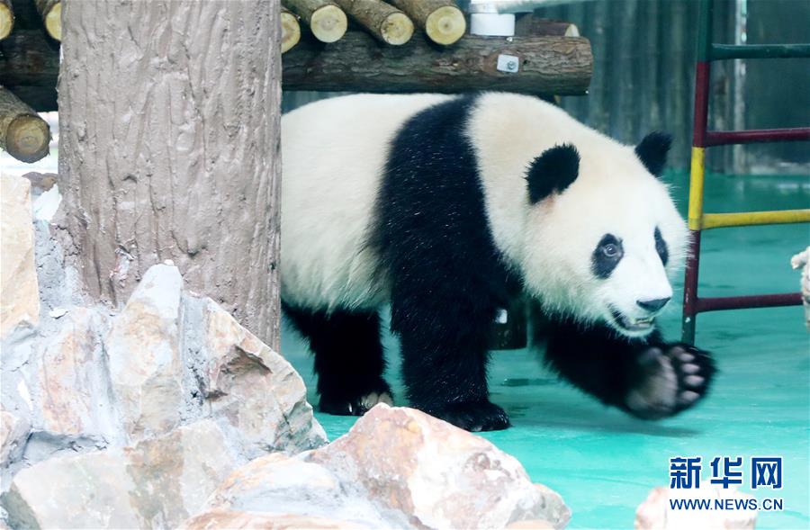 6月18日,大熊貓“和風”在裝修一新的大熊貓館內(nèi)散步。 當日,來自四川的大熊貓兄弟“和風”與“星光”飛抵上海,正式開始了在上海動物園為期三年的生活。為迎接這對“風光兄弟”,上海動物園將原有的大熊貓館擴建并裝修一新,空調(diào)、水池、游樂場以及竹葉儲存間等配置齊全。 新華社記者 方喆 攝
