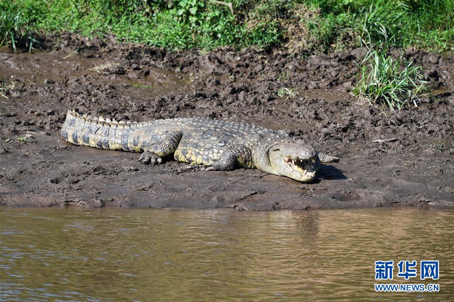 6月17日,在肯尼亞馬賽馬拉國家保護(hù)區(qū),一條鱷魚在水邊休息。 新華社記者 李琰 攝