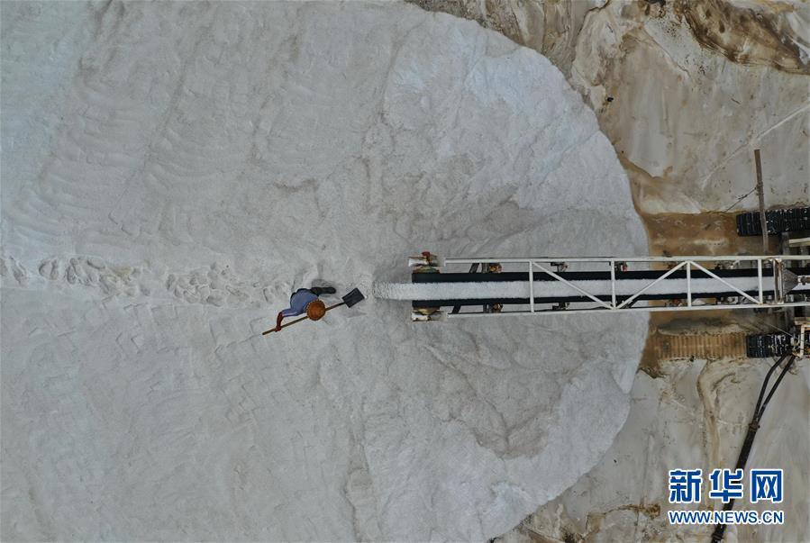 7月3日,唐山海港經(jīng)濟開發(fā)區(qū)大清河鹽場的工人在鹽堆上工作(無人機拍攝)。新華社記者 楊世堯 攝