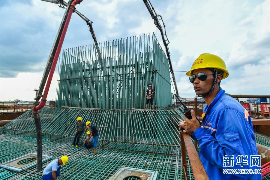 中鐵大橋局施工人員(右一)在湛江調(diào)順跨海大橋東岸主塔墩承臺(tái)現(xiàn)場(chǎng)指揮施工(7月6日攝)。 新華社記者 劉大偉 攝