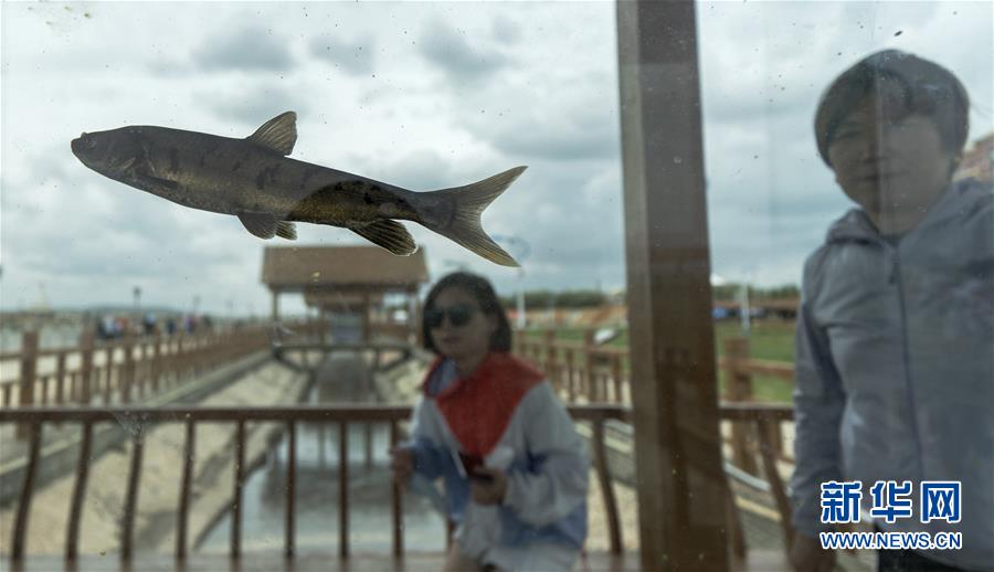 7月6日,在青海省剛察縣湟魚廣場(chǎng),兩名游客在觀賞魚缸中的湟魚。 新華社記者費(fèi)茂華攝