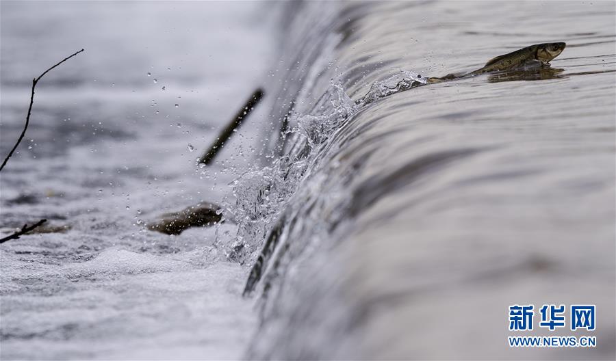 7月6日,在青海省剛察縣沙柳河里,一只湟魚躍起向上洄游。 新華社記者 費(fèi)茂華攝