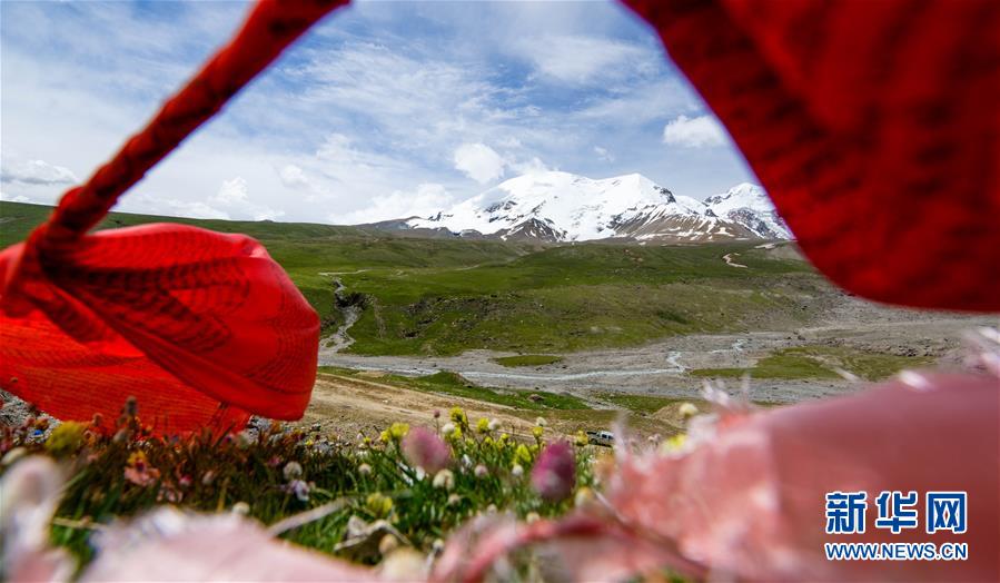 7月10日,阿尼瑪卿雪山山下掛著經(jīng)幡。 新華社記者 張宏祥 攝