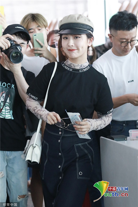 2019年7月25日,北京,楊紫現(xiàn)身機(jī)場。她穿黑色短T配牛仔裙變時(shí)髦女郎,戴報(bào)童帽架墨鏡”港風(fēng)女sir“即視感,人氣爆棚。