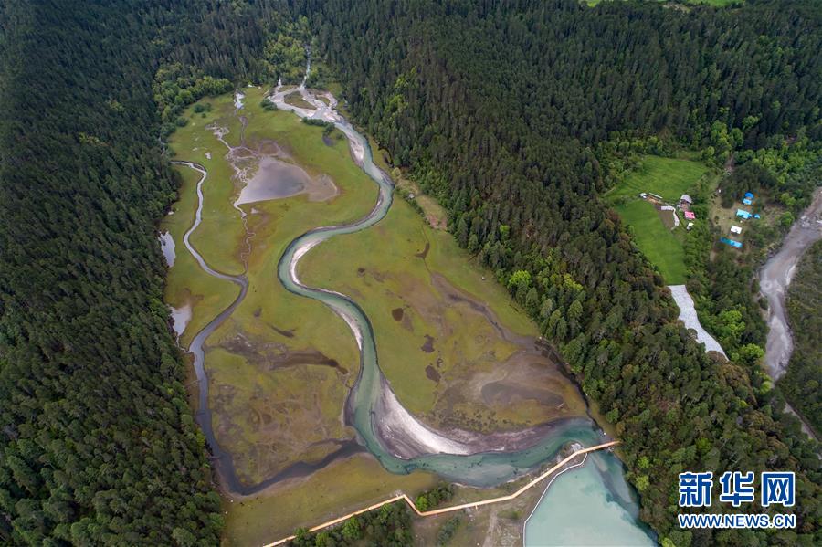 西藏林芝境內森林深處的村莊(5月17日無人機拍攝)。