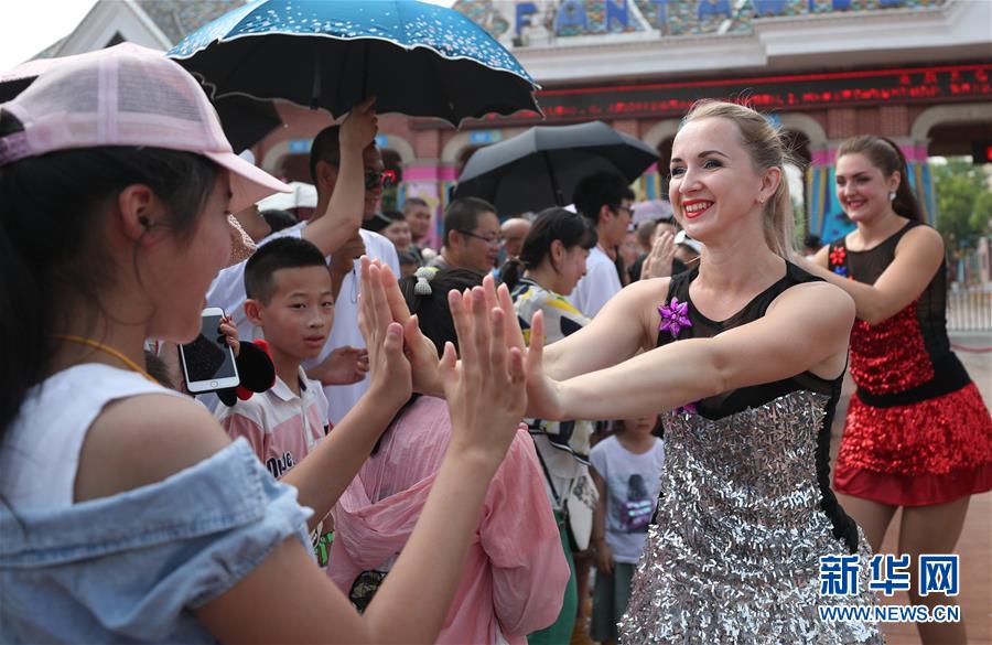7月31日,列娜(右二)表演后與游客互動(dòng)。新華社記者龍雷攝