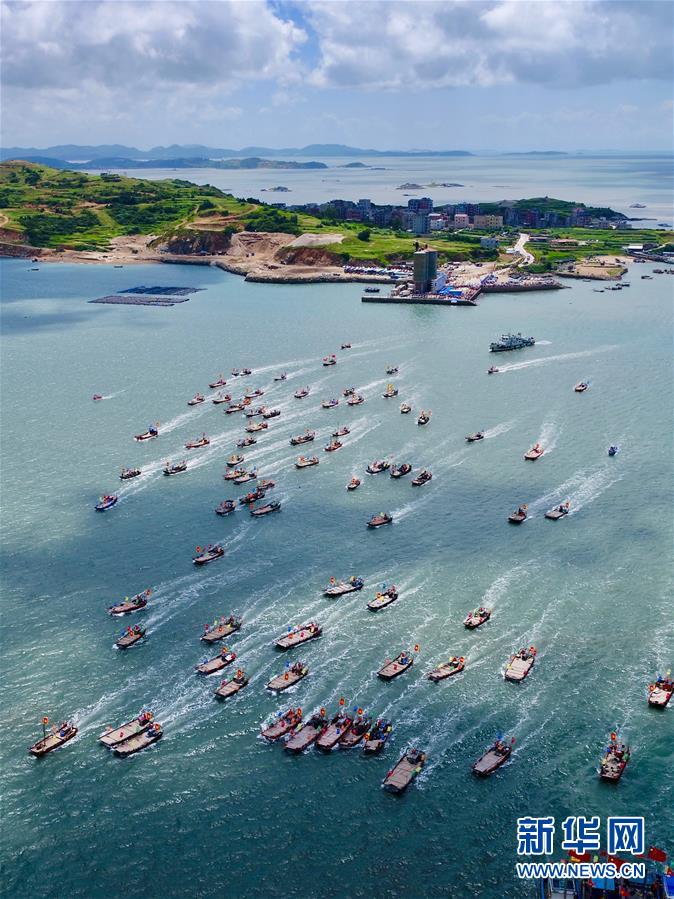 8月3日,在首屆福清開漁節(jié)上,漁船駛向大海(無人機(jī)拍攝)。新華社記者姜克紅攝