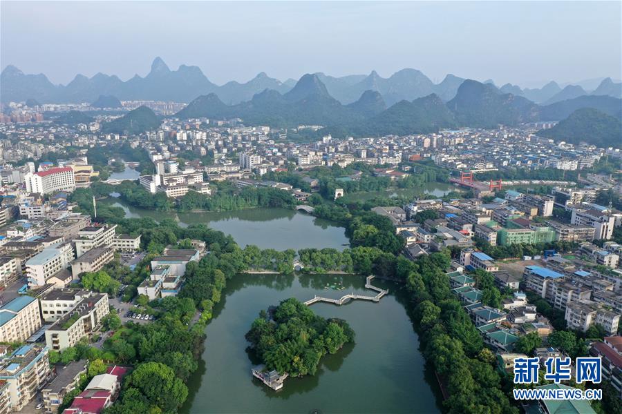 桂林市榕湖附近景觀(7月1日無人機拍攝)。 夏日時節(jié),廣西桂林市區(qū)內的榕湖、杉湖、桂湖、木龍湖等地綠樹成蔭、景色迷人。 新華社記者陸波岸攝