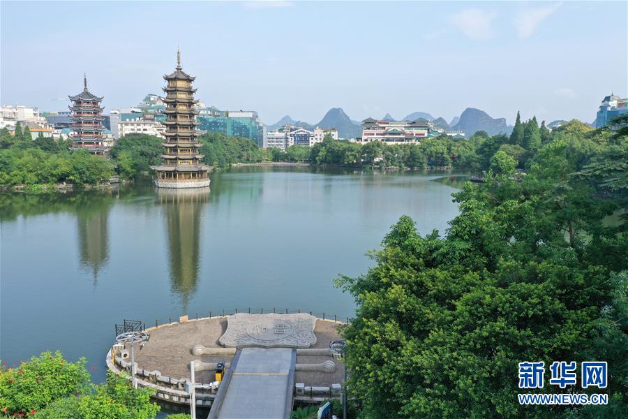 桂林市杉湖景觀(7月1日無人機(jī)拍攝)。 夏日時(shí)節(jié),廣西桂林市區(qū)內(nèi)的榕湖、杉湖、桂湖、木龍湖等地綠樹成蔭、景色迷人。 新華社記者陸波岸攝