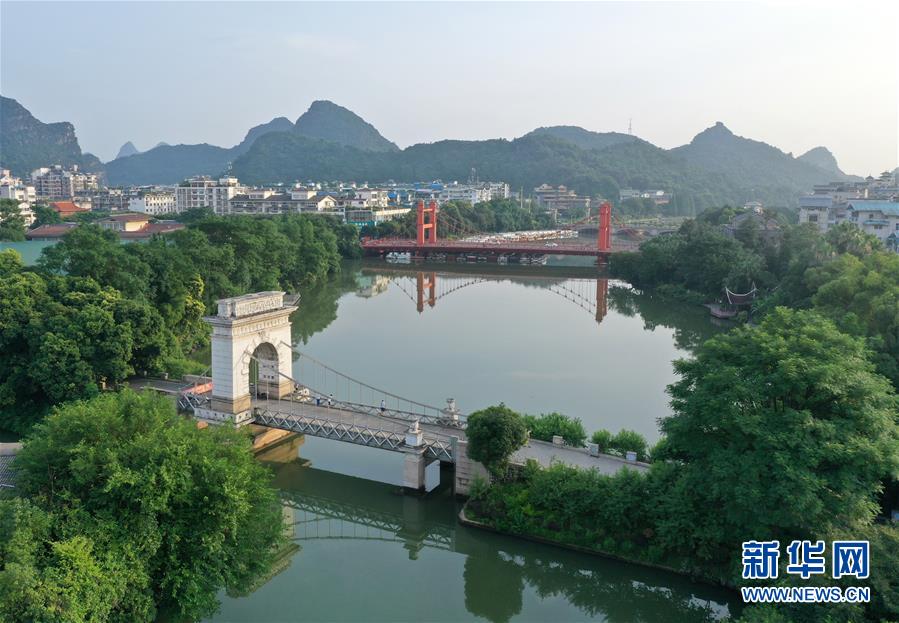 桂林市榕湖上的橋梁(7月1日無人機拍攝)。 夏日時節(jié),廣西桂林市區(qū)內的榕湖、杉湖、桂湖、木龍湖等地綠樹成蔭、景色迷人。 新華社記者陸波岸攝