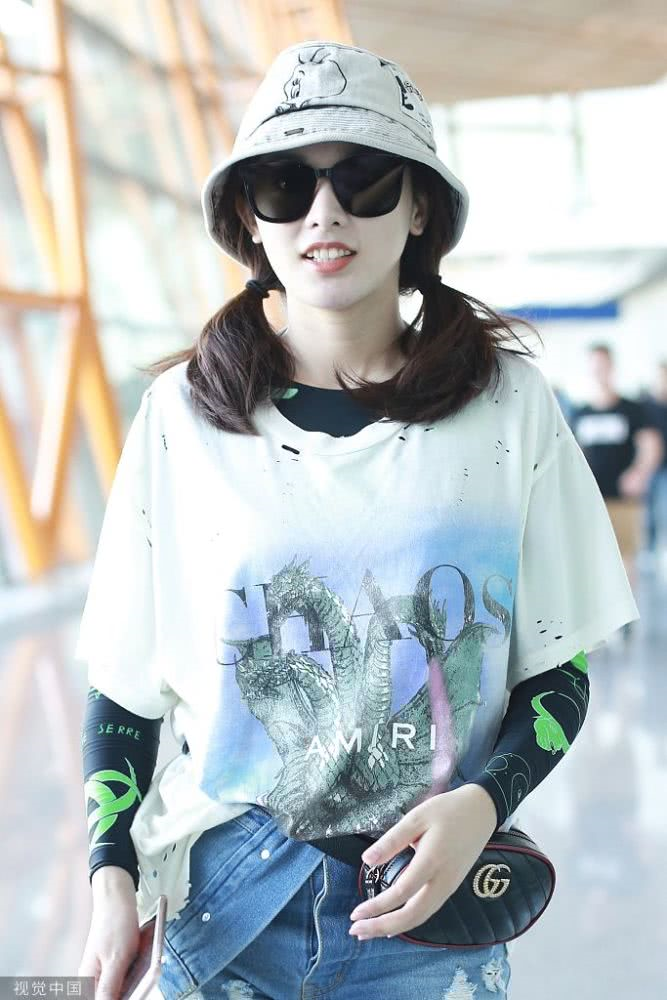 內(nèi)地女星彭小苒現(xiàn)身機(jī)場,穿印花T恤牛仔短褲,白色馬丁靴很時(shí)髦