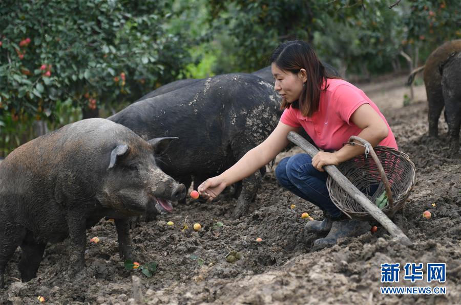 8月20日,康丹丹在果園內(nèi)喂豬吃海棠果。