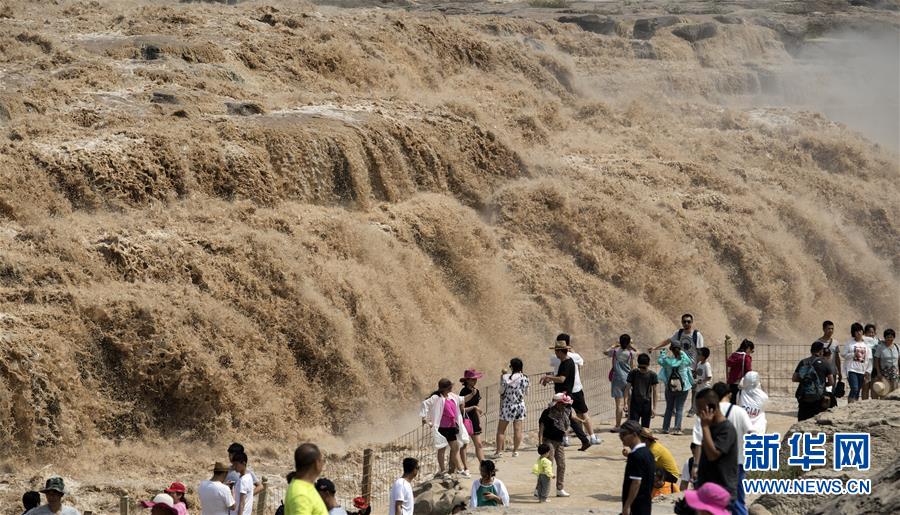 7月19日,游客在山西境內(nèi)的壺口瀑布群前留影。 新華社記者劉蓮芬 攝