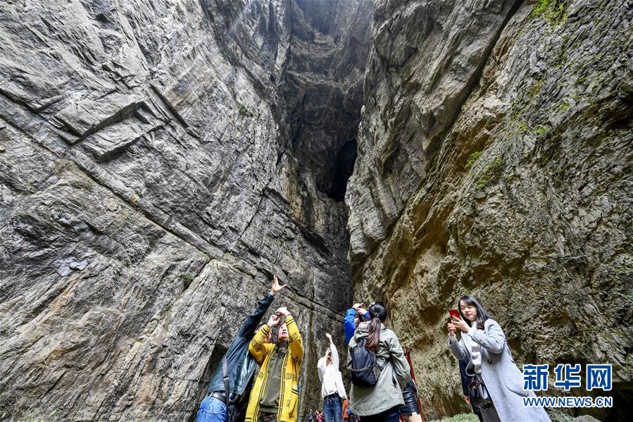 游客在天生三橋景區(qū)內(nèi)的黑龍橋景點(diǎn)游覽(3月27日攝)。 新華社記者劉潺攝