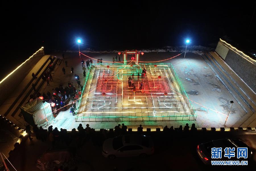 在武鄉(xiāng)縣大有鄉(xiāng)王莊溝村廣場上,村民們在九曲黃河燈陣中觀燈(2月16日無人機拍攝)。 新華社記者 詹彥 攝