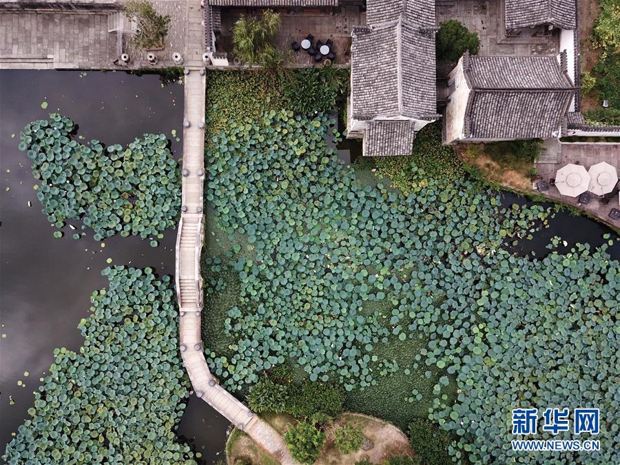 這是無人機(jī)拍攝的呈坎村內(nèi)的荷塘(8月28日攝)。新華社記者劉軍喜攝