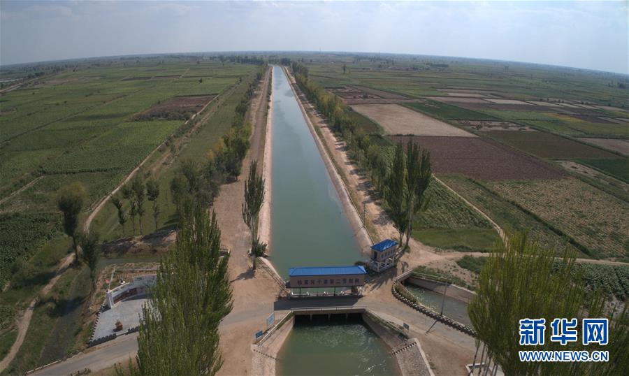 9月4日無(wú)人機(jī)拍攝的河套灌區(qū)楊家河干渠第二節(jié)制閘。 新華社記者 劉詩(shī)平 攝