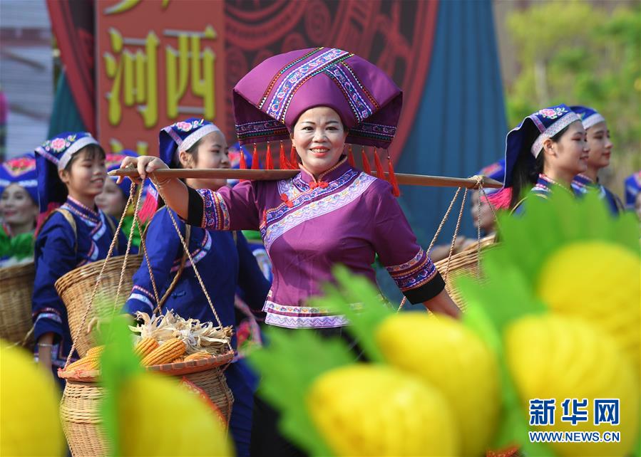 9月17日,廣西都安瑤族自治縣密洛陀文化公園廣場,演員在啟動儀式上表演節(jié)目《在希望的田野上》。 當日,2019年廣西慶?!爸袊r(nóng)民豐收節(jié)”啟動儀式暨河池市“慶豐收·促脫貧”系列活動在都安瑤族自治縣舉行,各族群眾和來賓一起載歌載舞歡慶豐收節(jié)。 新華社記者 陸波岸 攝