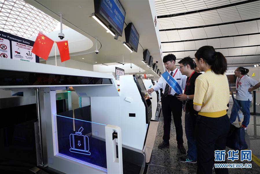 9月25日,中國南方航空公司工作人員(左)在北京大興國際機(jī)場介紹自助行李托運(yùn)設(shè)備。新華社記者鞠煥宗攝