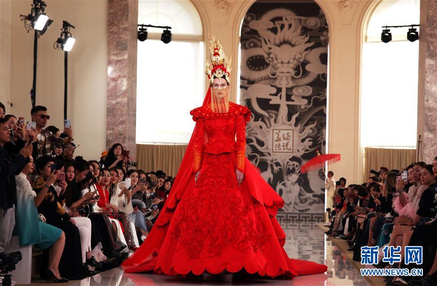 9月30日,在法國(guó)巴黎,模特展示中國(guó)高級(jí)女裝品牌“蓋婭傳說·熊英”2020春夏新品。