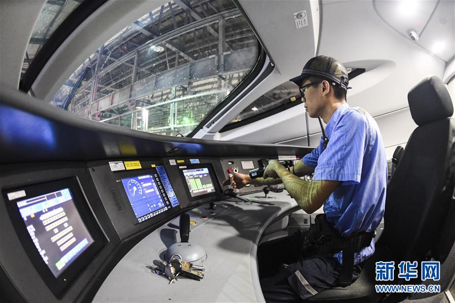 “動車醫(yī)生”在進行動車組放電作業(yè)(10月2日攝)。 新華社記者 曹祎銘 攝