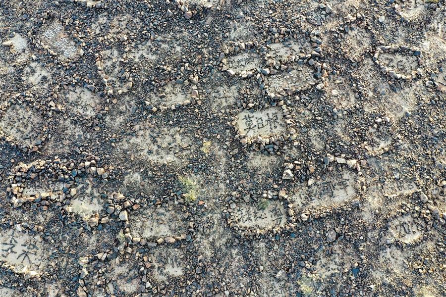 這是內(nèi)蒙古自治區(qū)額濟納旗算井子邊境派出所民警在大紅山上用石塊擺成的姓名和各種字樣(9月27日無人機拍攝)。新華社記者劉磊攝
